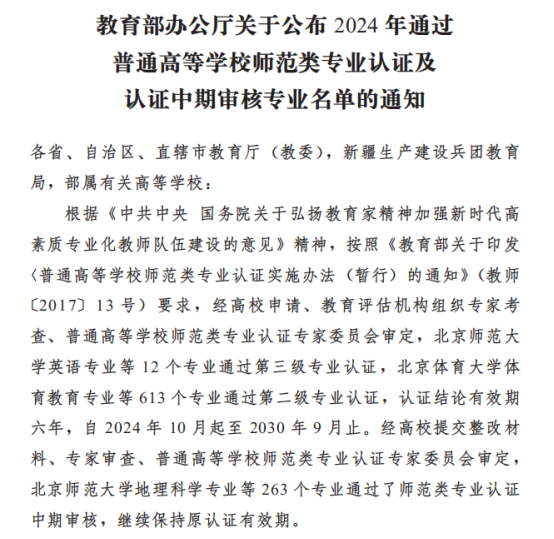 10月21日,教育部办公厅发布了《关于公布2024年通过普通高等学校师范类专业认证及认证中期审核专业名单的通知》(教师厅函〔2024〕20号),必赢官网汉语言文学、物理学专业顺利通过教育部师范类专业第二级认证,认证结论有效期六年。化学专业经提交整改材料、专家审查、普通高等学校师范类专业认证专家委员会审定通过了师范类专业认证中期审核。