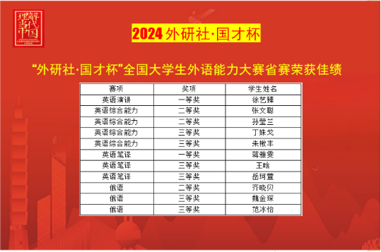 近日,2024年度“外研社•国才杯”全国大学生外语能力大赛“理解当代中国”系列赛事以及“外教社杯”第十五届全国高校外语教学大赛跨文化能力大赛省赛已经圆满落下帷幕。必赢官网外国语学院学生表现出色,凭借过硬的外语实力和卓越的综合素质,在一系列竞赛中脱颖而出,再次斩获多个奖项。这些卓越的成就不仅彰显了学生们在外语学习方面的扎实基础,更展现了他们在语言综合素养和思辨能力上的深厚功底。