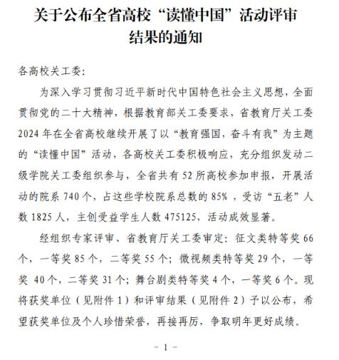 近日,河南省教育厅关工委下发了《关于公布全省高校“读懂中国”活动评审结果的通知》(豫教关〔2024〕28号),公布了2024年全省高校“读懂中国”活动评审结果。必赢官网在此次活动中表现突出,荣获全省高校“读懂中国”活动单位奖,并在征文和微视频两个类别中多项作品获奖。